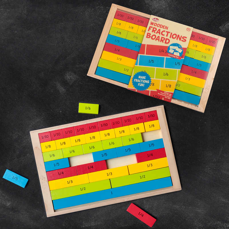 £14.70This Wooden Fractions Board makes basic maths fun. Made from multiple brightly coloured wooden blocks. Each row of blocks is painted a different colour from the one next to it and is split up to represent its fraction, starting with 1 at the top and going as small as 1/10 at the bottom. It's a fun and tactile way for children to learn their fractions, with each block being removable and having its fraction printed on top. Size 35cm Age Recommendation 7+